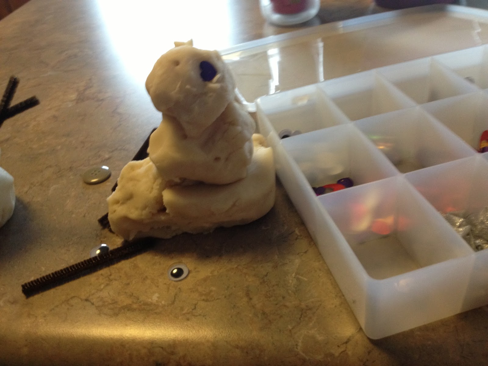 Little O made her own version. She used googly eyes at first, but switched them out for buttons later. She also used some brown pipe cleaners and skewered her snowman. They sort of look like arms!